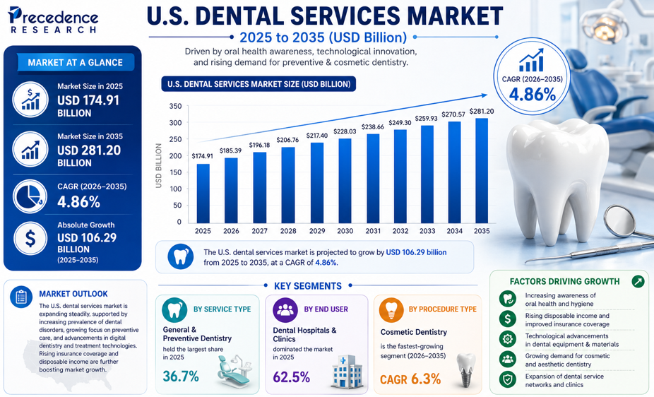 Ottawa, April 30, 2026 (GLOBE NEWSWIRE) — According to Precedence Research, the U.S. dental services market size is valued at USD 185.39 billion in 2026 and is projected to reach nearly USD 281.20 billion by 2035, expanding at a robust CAGR of 4.86% from 2026 to 2035. The in the U.S. dental services market Growth is driven by rising oral health awareness, expanding insurance coverage, aging population needs, and increased adoption of preventive and cosmetic dentistry.