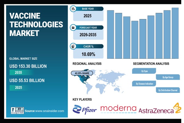 Austin, United States, April 16, 2026 (GLOBE NEWSWIRE) — According to SNS Insider, The Vaccine Technologies Market size was valued at USD 55.53 Billion in 2025 and is projected to reach USD 153.30 Billion by 2035, growing at a CAGR of 10.69% during 2026–2035. The market for vaccine technologies is expanding quickly as a result of improvements in next-generation mRNA delivery methods that improve targeted immune response, safety, and efficacy.