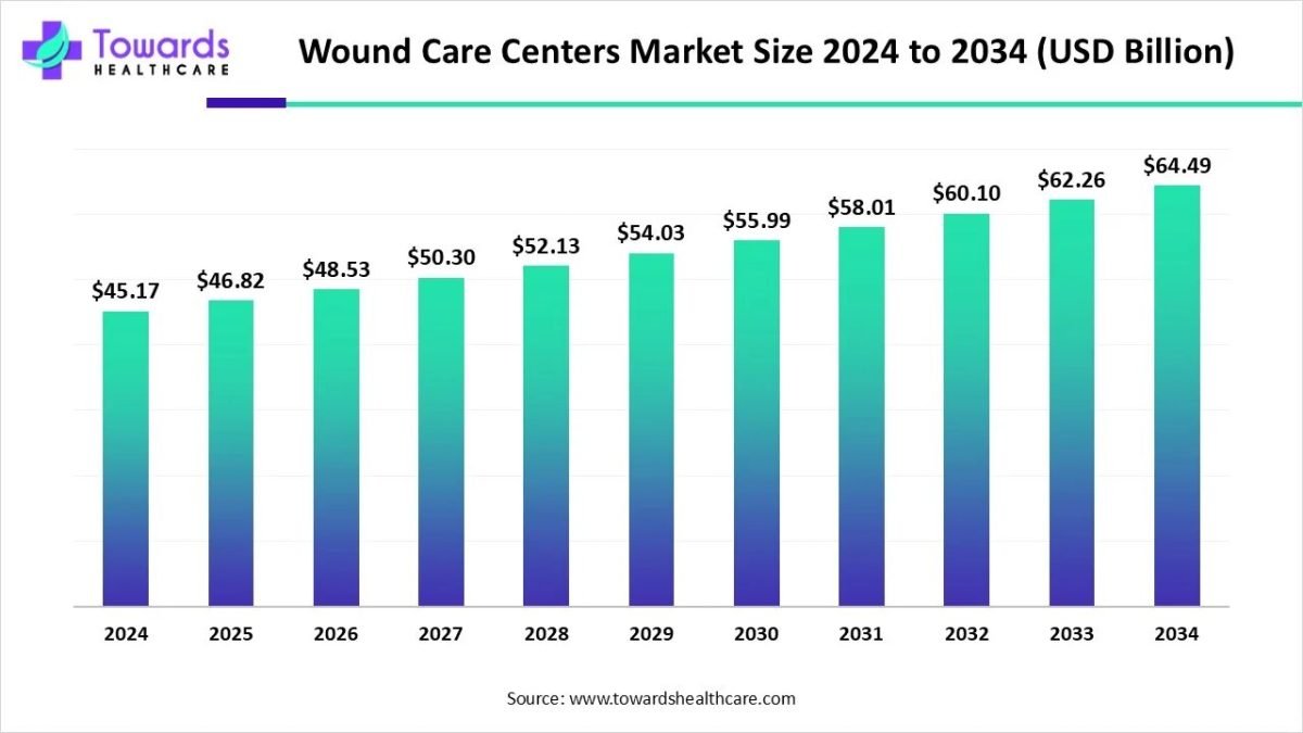 Ottawa, Nov. 12, 2025 (GLOBE NEWSWIRE) — The global wound care centers market size was valued at USD 45.17 billion in 2024 and is predicted to hit around USD 64.49 billion by 2034, rising at a 3.64% CAGR, a study published by Towards Healthcare a sister firm of Precedence Research.