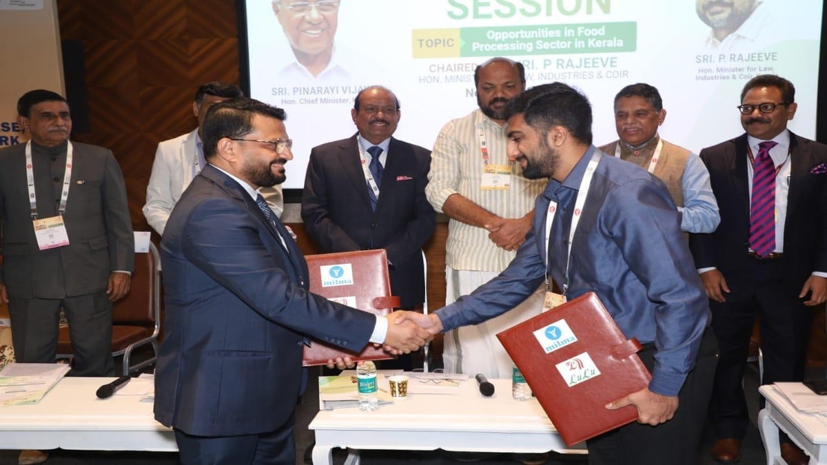 The MoU was signed by KCMMF Managing Director Mr Asif K. Yusuf and Lulu Group Director Mr Salim M.A. in the presence of Kerala Industries Minister Mr P.Rajeeve, Kerala Principal Secretary (Industries and Norka) Suman Billa, Lulu Group Chairman and Managing Director Mr M.A. Yusuff Ali and KCMMF Chairman Mr K.S. Mani on the sidelines of the World Food India-2023 at the Pragati Maidan in New Delhi.