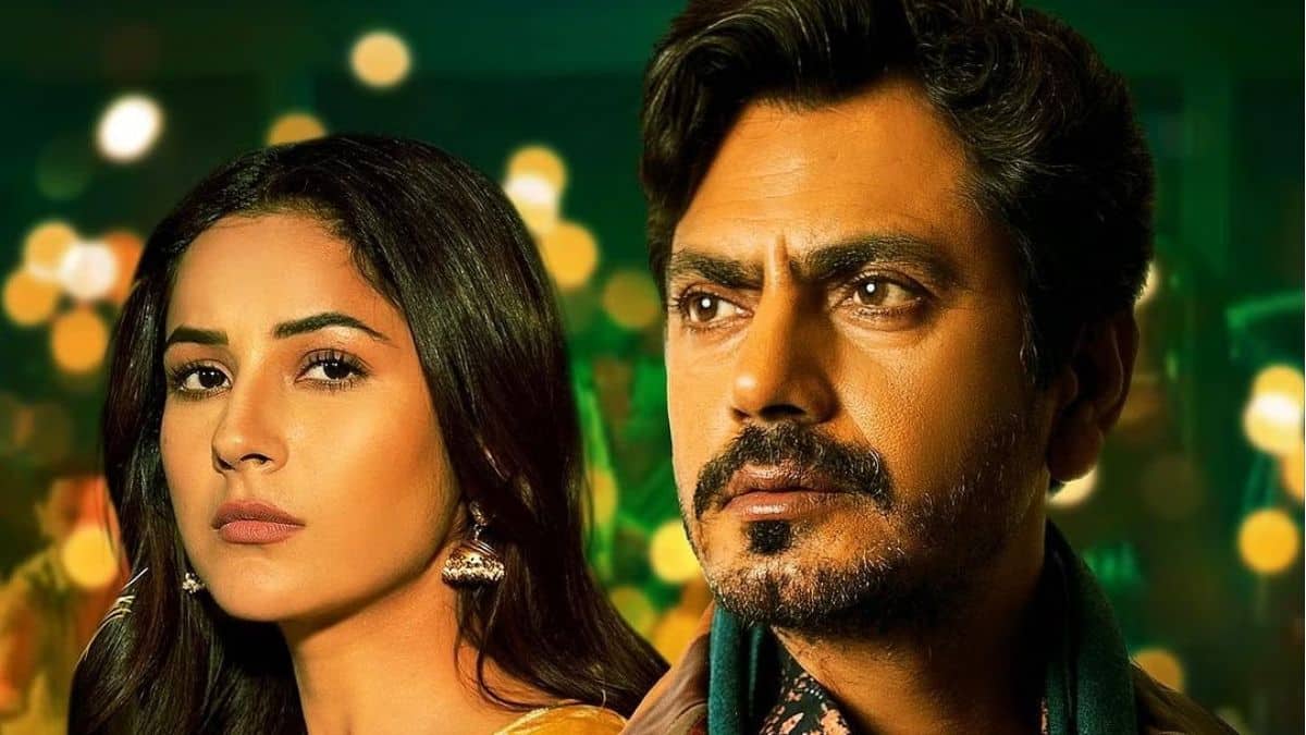 Shehnaaz appears in the image sporting a yellow salwar suit, while Nawazuddin wears a leather jacket over a floral shirt and a silencer. Both stars have serious expressions on their faces, which adds to the visual’s suspense.