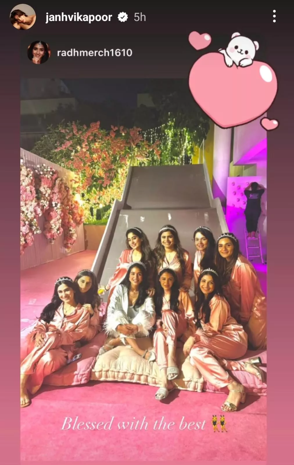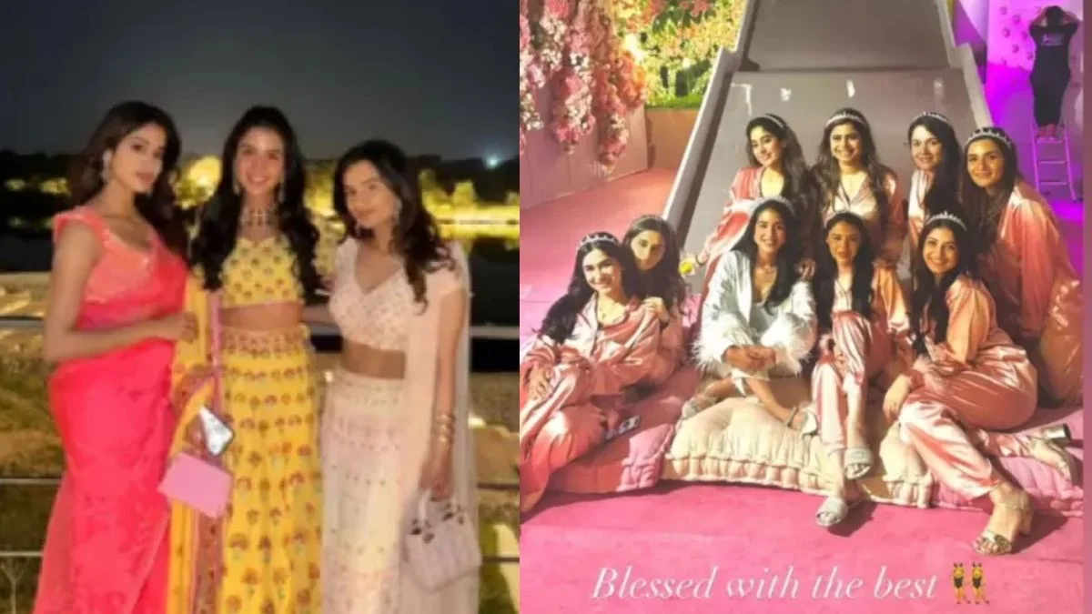 Radhika Merchant took to Instagram Stories to share a picture from her bridal shower featuring her girl gang and captioned the post, “Blessed with the best.” The photo shows Radhika sitting with her friends and posing for the camera. Another picture from the bridal shower shows Janhvi and the other bridesmaids posing in pink-hued outfits to match the pink floral-themed shower decor. While her bridesmaids chose pink silk pyjama sets for the occasion, the bride-to-be Radhika stunned in an ivory-coloured loungewear set. They also wore embellished headbands to go with their outfits.