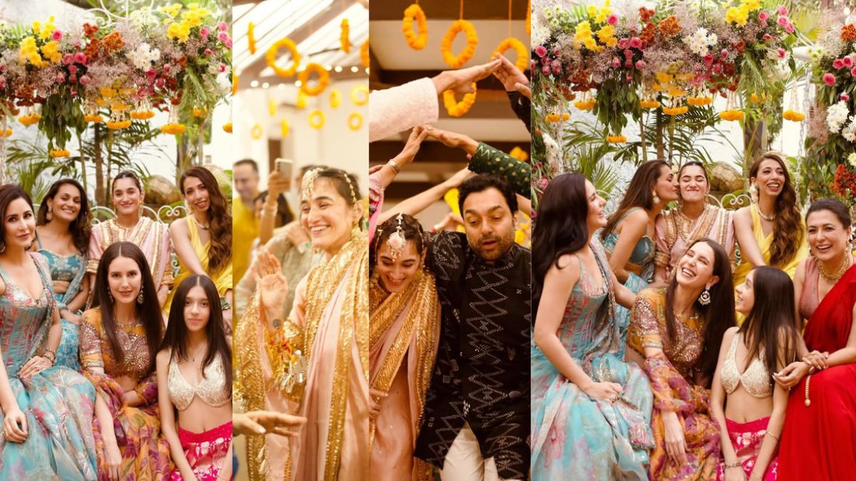 The series of pictures captures the essence of a grand yet intimate celebration, marked by tradition, laughter, and camaraderie. One image showcases Kaif seated elegantly in a floral-themed setup alongside a group of women dressed in vibrant ethnic ensembles. The bride, Karishma Kohli, radiates joy in a pastel pink and gold embroidered outfit, surrounded by friends, including Kaif, who donned a blue and gold lehenga. Another image captures a candid moment of Kohli dancing in a festively decorated venue adorned with marigold garlands, exuding traditional charm. The groom, Mikhail, also features in the celebrations, seen cheerfully joining Kohli in a lively wedding ritual.