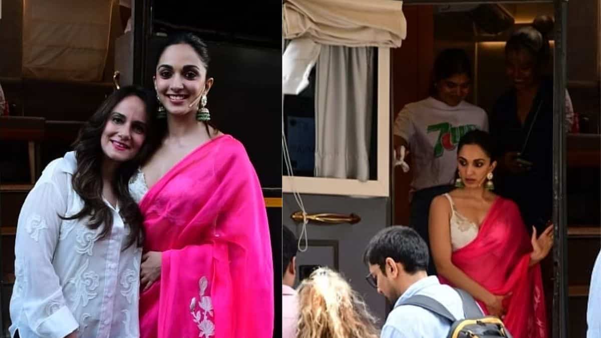Kiara entered the site with both of her mothers after exiting her vanity van wearing a hot pink saree. View the video below.