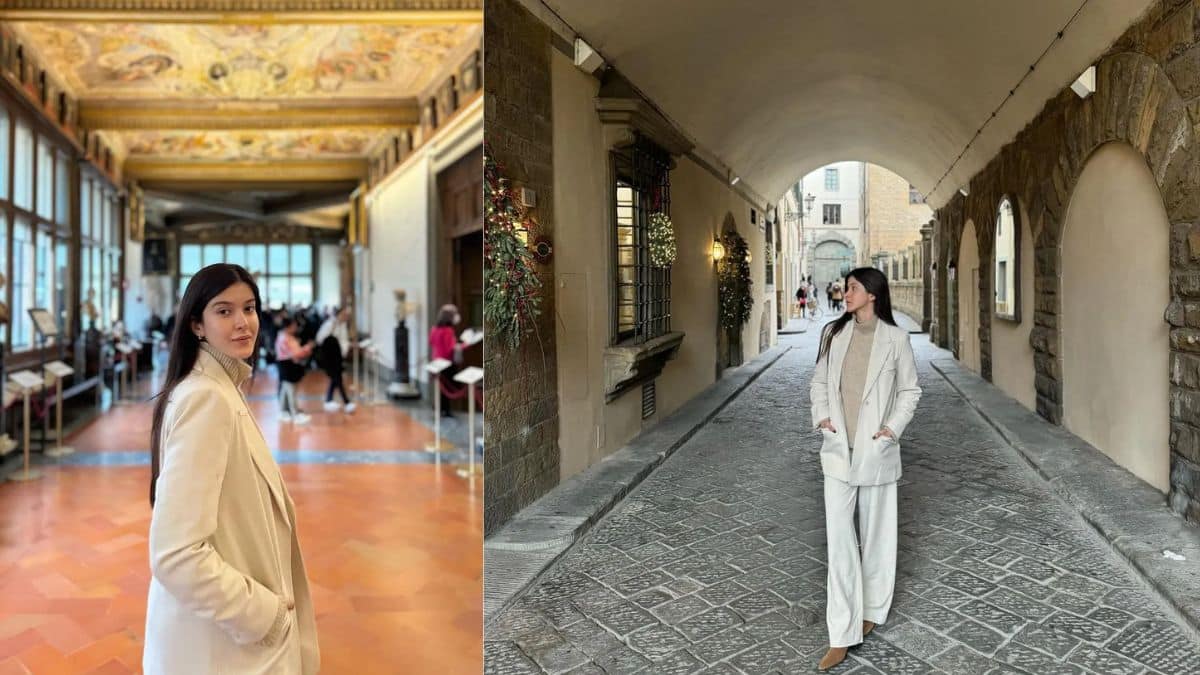 Shanaya Kapoor has started the year with a winter wardrobe that blends seamlessly into the season. She shared a series of photos on Instagram showcasing a range of outfits, including biker jackets and structured suits. Her classic off-white suit, paired with a beige knitted sweater, aligns with the tones of the “vanilla girl” trend and caught attention.