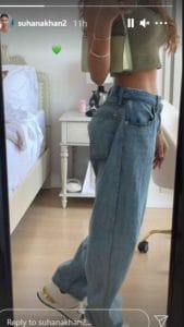 Her latest post on her Instagram handle is pure fitness goals. Suhana Khan is seen flaunting her midriff as she poses in her New York apartment. She let her fans get a glimpse into her cosy and sunlit New York bedroom. With her face cropped off, she can be seen wearing baggy jeans and a beautiful olive-green crop top.