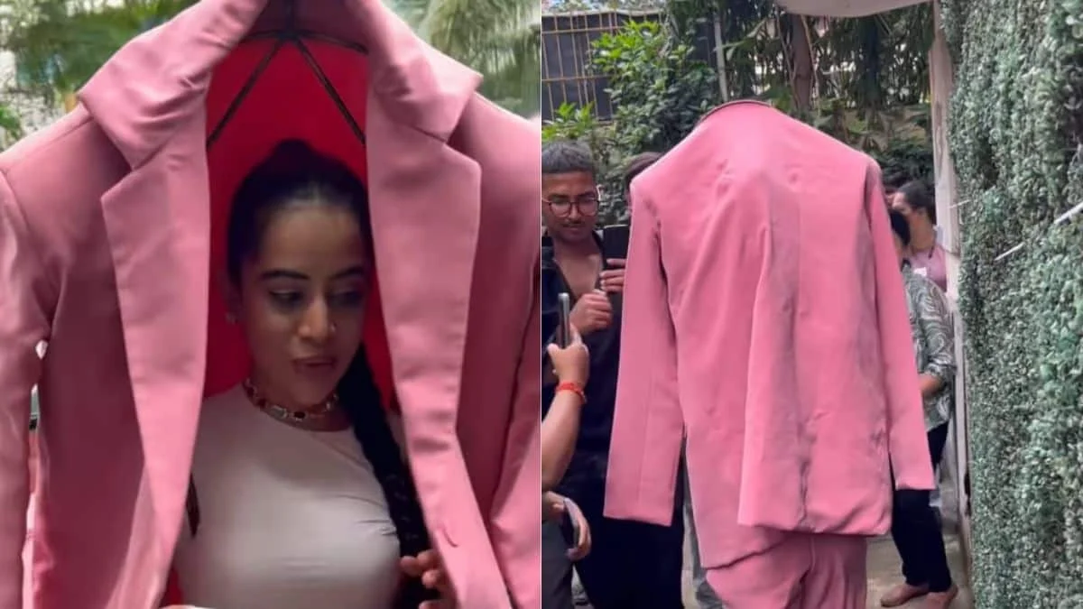 Recently, Urfi was spotted wearing a pink formal tuxedo suit by the celebrity photographer Viral Bhayani. However, the catch was that the blazer was in gigantic size, which almost covered her torso and face. She is even seen wearing a white basic top inside and has her hair tied up in a ponytail. Before entering the venue, Urfi poses for the paparazzi and showcases her outfit.
