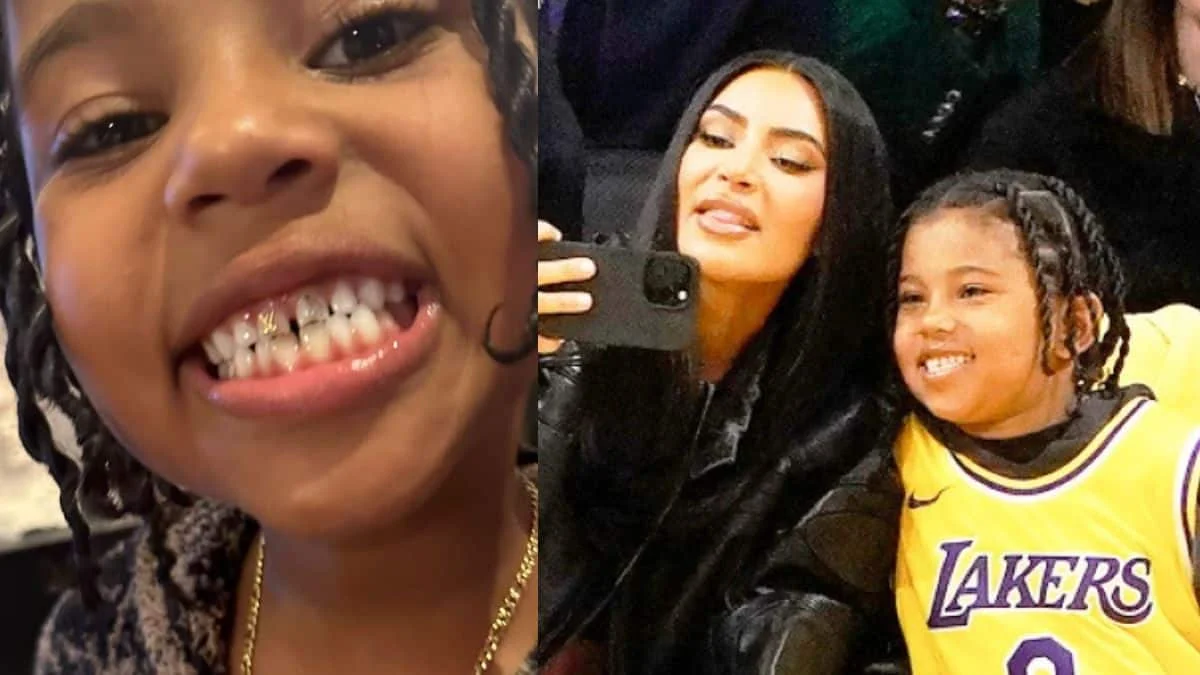 Saint West is adorning his baby teeth! The 7-year-old was spotted wearing Louis Vuitton tooth gems on his top incisors, as well as a diamond-encrusted gold nameplate necklace. The teeth gems were designed to resemble the Louis Vuitton emblem.