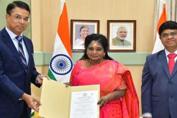 Telangana Chief Electoral Officer Vikas Raj called on Governor Dr Tamilisai Soundararajan on Monday and submitted the notification containing the names of elected members to the Legislative Assembly.