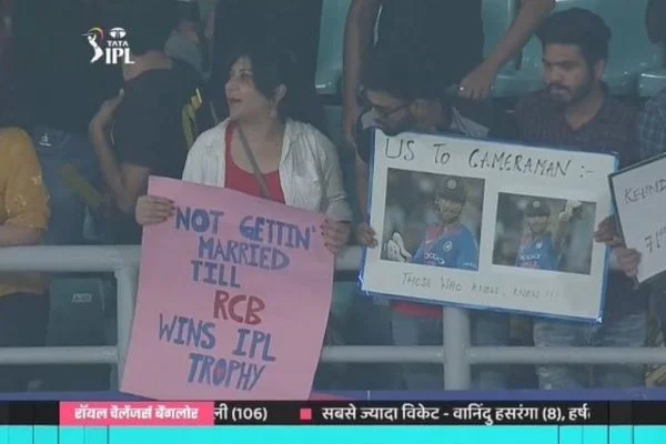 During the game, a crazy fan was seen holding a poster in which she mentioned that she won't be getting married until RCB wins the IPL trophy.