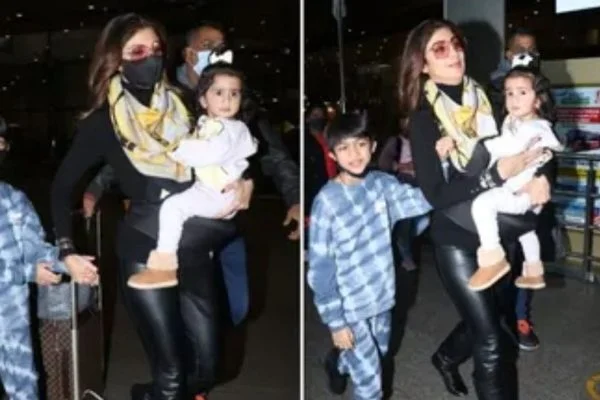 Shilpa Shetty reacts to the paparazzi as they ask her son Vivaan to remove mask at the airport