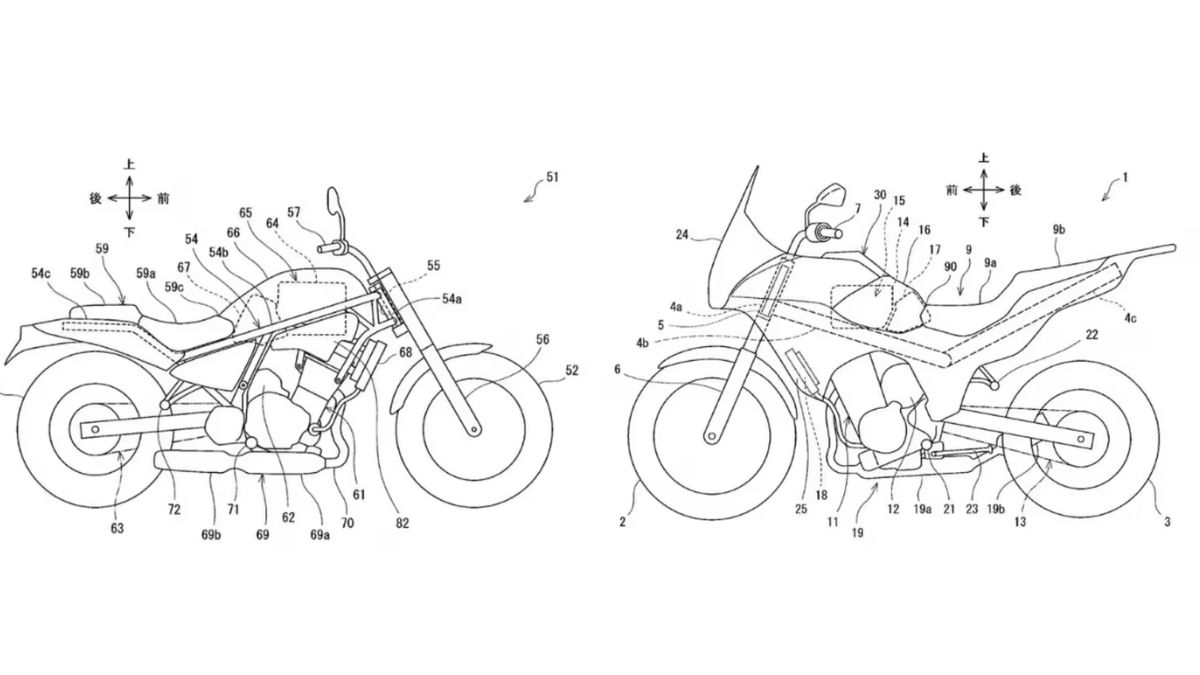 Moving the battery above the engine is Kawasaki’s solution for the Versys and Eliminator hybrids, according to recent patent photos. This design choice creates extra space behind the seat, which is crucial for maintaining the Eliminator’s low-slung cruiser appearance. This configuration will also help the Versys, as it will give it more space for its long-travel suspension.