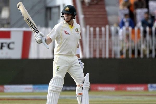 Steve Smith reaches his 35th Test fifty with a single off the last ball. There were 129 balls in all, including five fours. Sajid Khan's 12th over yielded one run.