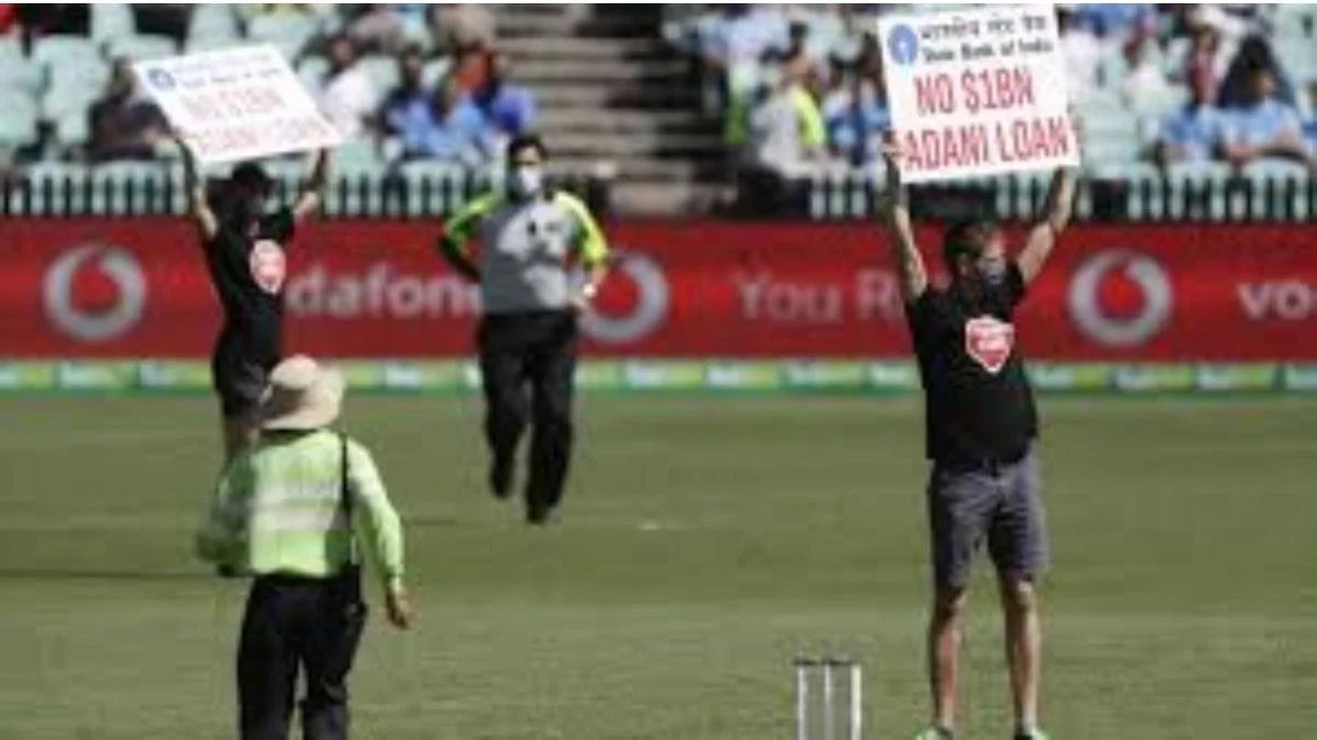 During the sixth over of the first ODI between India and Australia, two men entered the field as a form of protest against the Adani group’s coal project in India.