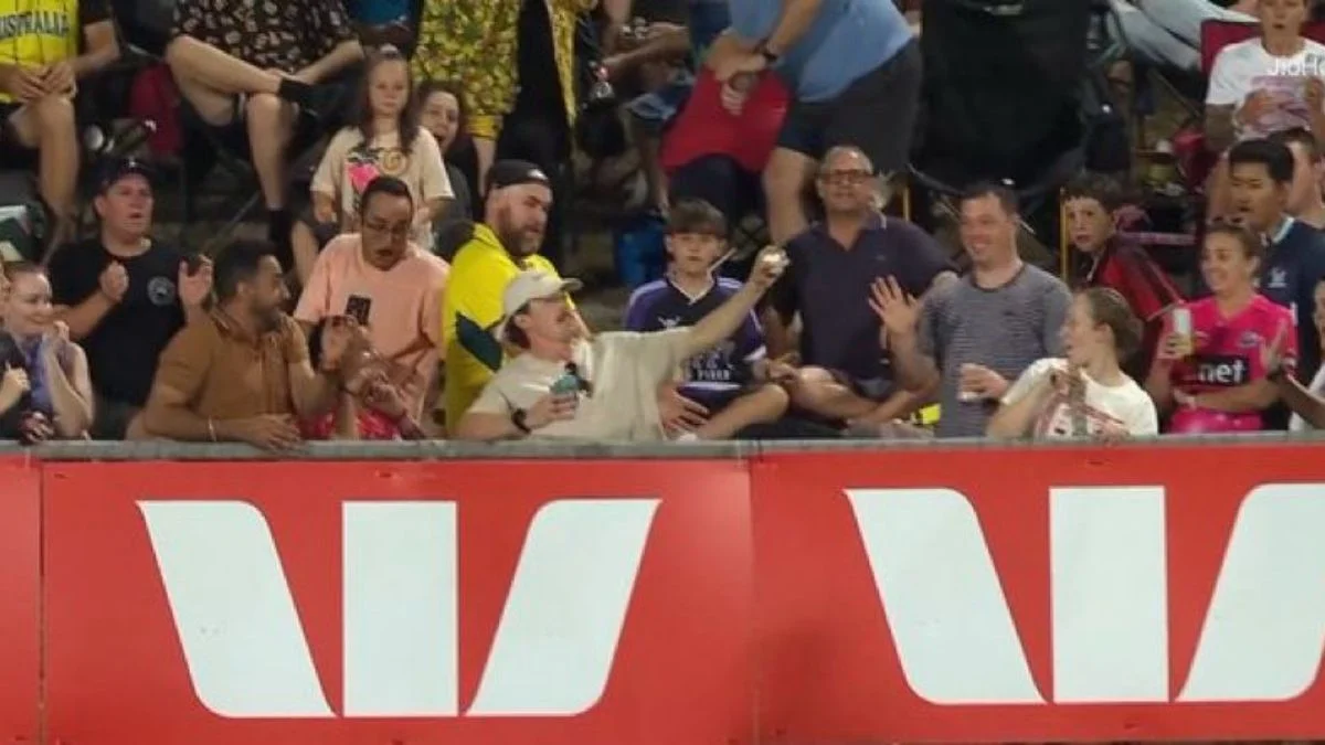 The moment came in the 13th over, on ball 12.4, when Tim David launched Corbin Bosch over deep square leg for a six. The ball travelled flat and fast towards the crowd, where the fan, sitting in the front row, showed remarkable reflexes. Holding two beer cans in his right hand, he stuck out his left hand and completed the catch cleanly, sparking loud cheers from the Darwin crowd.