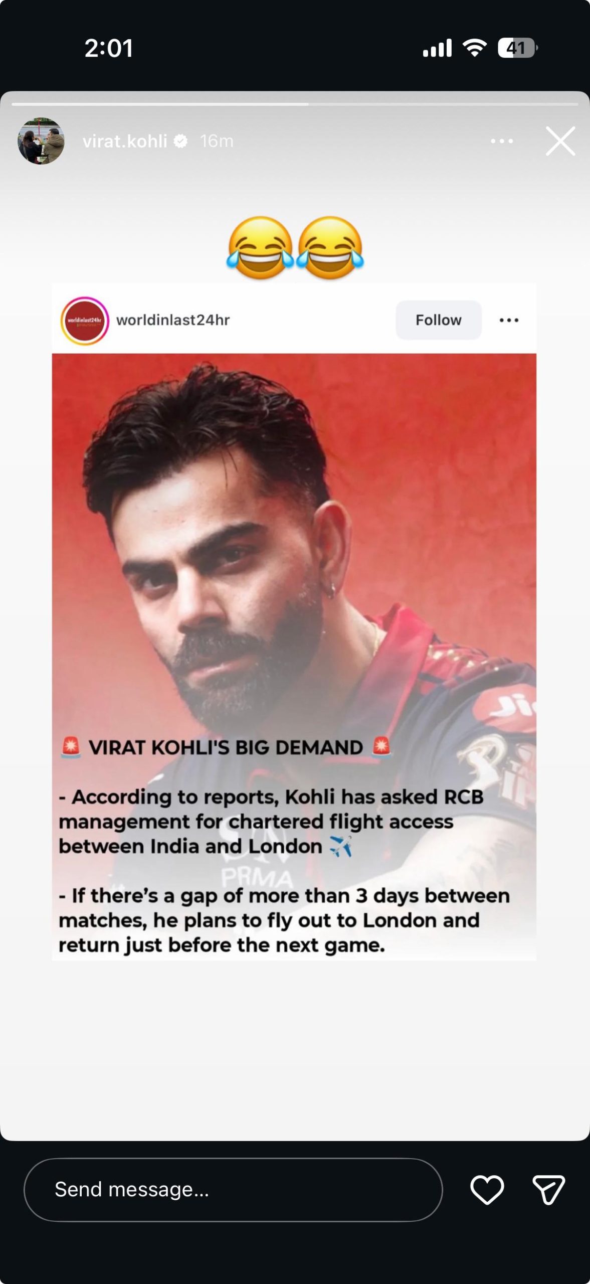 The post, shared by the Instagram page worldinlast24hr, alleged that Kohli had approached the RCB management requesting a private jet arrangement to allow him to visit London whenever there was a break of more than three days between fixtures. The claim spread quickly across social media platforms before Kohli reacted to it on his own Instagram story, resharing the post with a pair of 😂😂 emojis — offering no words, but making his position abundantly clear.