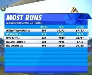 Mithali is second only to Charlotte Edwards in terms of overall leading run-scorer in women’s international cricket. The former England player has scored 10,207 runs from 309 matches with 67 half-centuries and 13 hundred. The possibilities of Mithali over taking Edwards in future are rather high.