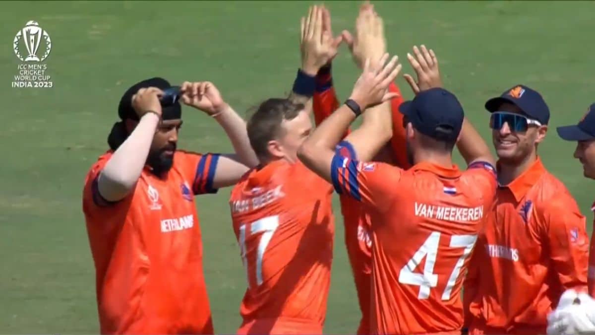 The bustling right hand fast bowler Logan van Beek dismissed Pakistan’s dangerous opener Fakhar Zaman with a caught & bowled. Fakhar who looked in a good touch today, smashed three boundaries but was tricked in Beek in his second over.
