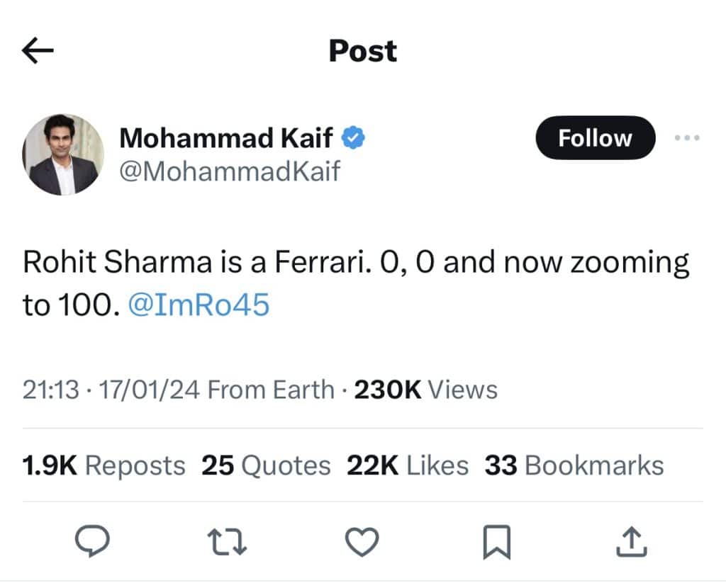 Ex-Indian cricketer turned commentator Mohammad Kaif metaphorically stated Sharma as a Ferrari. Rohit is a Ferrari, Kaif tweeted.