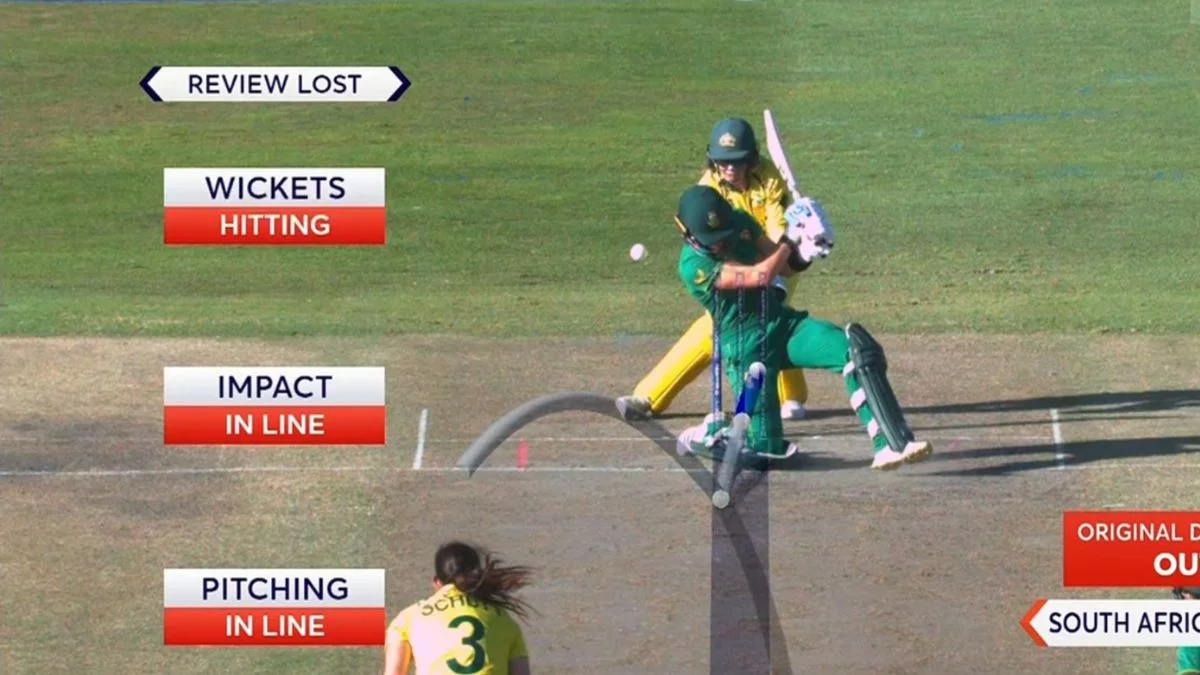 Wolvaardt gets up and walks away after a good knock. This was far too crowded to be slogging across the finish line on one knee. Schutt uses her wide angle to her advantage. Wolvaardt was hit on the back thigh pad after missing. The impact plumb is in front of the middle, and the ball-tracker indicates a hitting leg stump. A devastating blow for South Africa. They’ve lost their set batter, and Chloe Tryon’s timing at the other end is still off.