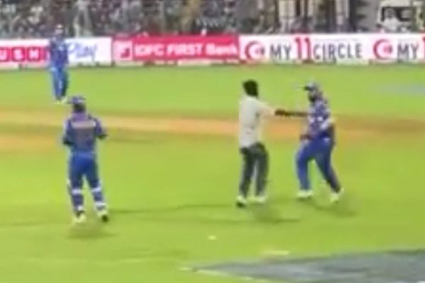 A fan invaded the pitch during Mumbai Indians and Rajasthan Royals to meet Rohit Sharma and Ishan Kishan at Wankhede stadium.