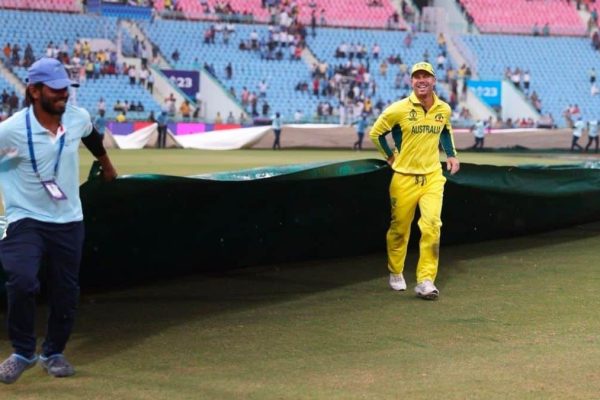 SL vs AUS World Cup 2023: Australian veteran David Warner helps ground staff to cover pitch Cricket · Oct 16, 2023