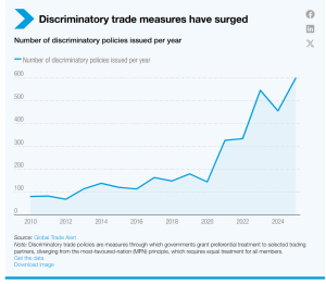 Discriminatory policies have accelerated dramatically since 2010, with annual issuances climbing from low dozens to peaks exceeding 500 by 2024, diverging from the most-favoured-nation principle that demands equal treatment among trading partners. This surge, tracked by independent monitors, exposes vulnerabilities in export-dependent economies, where sudden barriers disrupt supply chains and inflate costs for machinery, energy, and inputs critical to industrialization. Developing nations, often reliant on narrow export bases, face amplified shocks from such volatility.