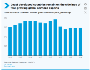 Evolving trade demands rules for services, digital, and green shifts, where LDCs capture under 1% of global services exports—growing at 3% annually (2014-2024) versus 5.3% worldwide. Multilateral clarity on digital trade, finance, and professions, plus bolstered special and differential treatment, would unlock participation.