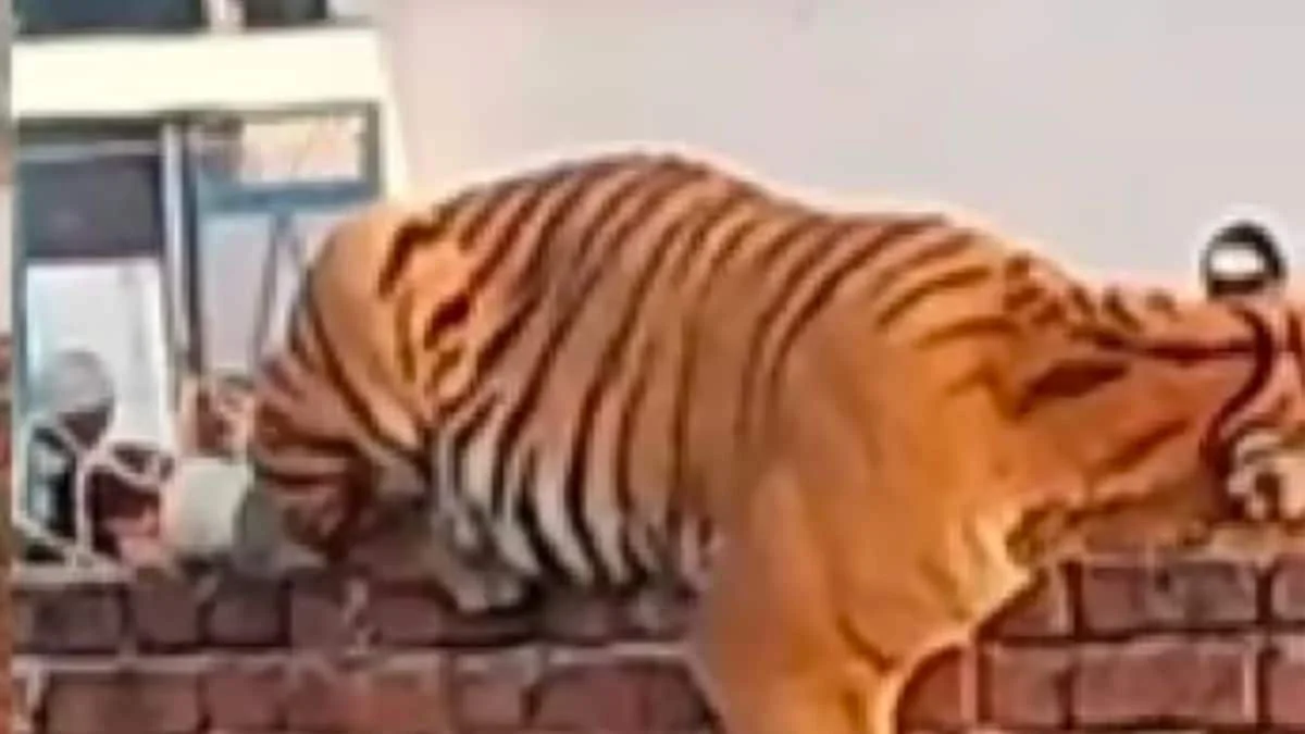 In a surprising turn of events, a tiger managed to escape the confines of the Pilibhit Tiger Reserve in Uttar Pradesh and found its way into Atkona village around 2 am. The big cat eventually perched on the compound wall of a Gurudwara, prompting locals to alert the forest department. A video capturing the tiger comfortably resting on the Gurudwara’s wall has circulated on social media.