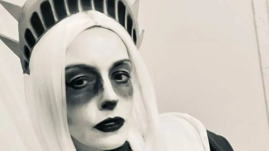 In her Halloween post, Hathaway wrote, “🎃 🖤 Boo York City 👻 🗽,” perfectly encapsulating her playful and spooky spirit. The costume was a fusion of traditional and terrifying elements, featuring a platinum blonde wig, white face makeup, and dark, dramatic eye makeup paired with deep red lipstick.