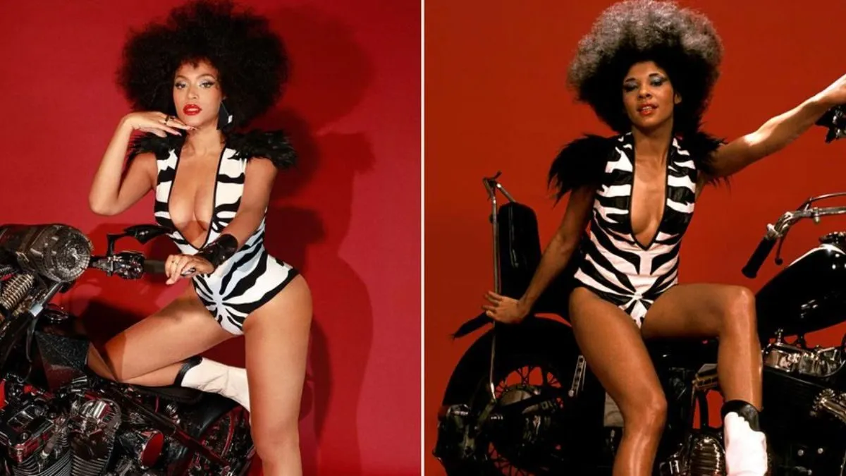 In the images, Beyoncé is the spitting image of Davis, donning a black and white plunging bodysuit that mirrors the look from Davis’ This Is It album cover. She accessorized with silver jewelry, bold red lipstick, and a voluminous teased-out afro, truly embodying the spirit of the 1970s funk movement.