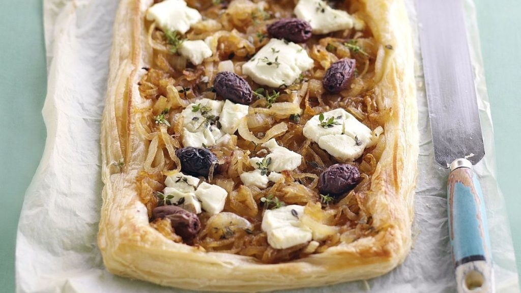 13. Remove from the oven and let cool slightly before slicing. Serve warm or at room temperature. Enjoy this sophisticated and flavorful tart as an appetizer or light meal!