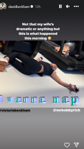 “Not that my wife’s dramatic or anything but this is what happened this morning,” he wrote on a picture of Victoria stretched out, laying on the floor, on her back, next to the treadmill. The 48-year-old former English pro footballer also added a roll-eye emoji.