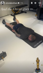 “And the Oscar goes to…” she wrote on a picture of David sprawled across the floor on yoga mat.