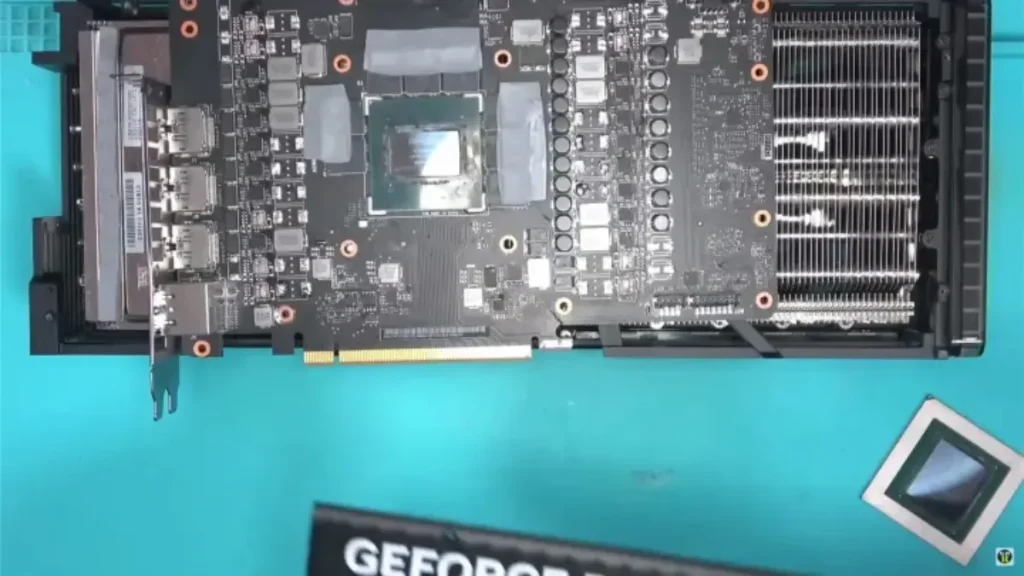 The customer sent the GPU to North West Repair for repairs, citing “shipping damage.” However, the issues went beyond what could occur during shipping. The inspection revealed a cracked PCB, a melted power connector, and suspicious signs, such as overly tight screws and a fake anti-tamper sticker. Upon removing the heatsink and exposing the PCB, it was discovered that the GPU, which was supposed to house an AD102 chip, actually contained an AD103 chip typically found in a desktop RTX 4080. The PCB itself exhibited multiple problems, including missing memory cooling pads and sections that were fried.
