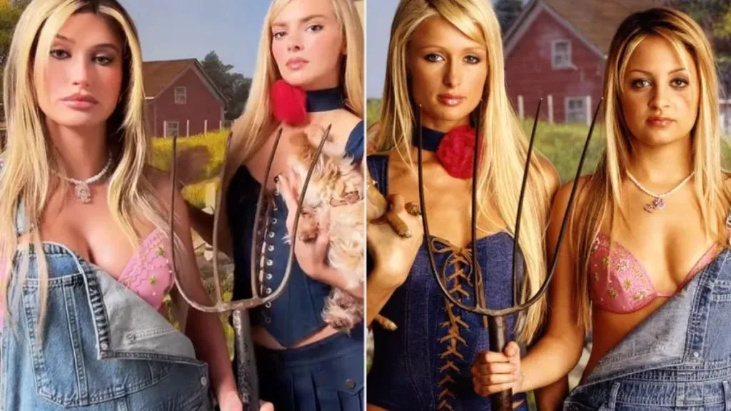 Bieber and Jenner recreated the look down to the smallest details, echoing the series’ satirical Americana aesthetic, famously influenced by Grant Wood’s American Gothic. Dressed as Nicole Richie, Bieber rocked half-buckled overalls, which teased a pink pushup bra. She added a farmer’s pitchfork for authenticity, posing against a rustic barn background. Her golden hair, left loose and styled with iconic pearls, captured Richie’s unforgettable on-screen presence. Jenner, taking on the role of Paris Hilton, wore a lace-up denim corset and matching miniskirt, carrying a tiny Yorkshire Terrier reminiscent of Hilton’s own famous pets. She completed the look with a blonde wig and a choker adorned with a single rose.