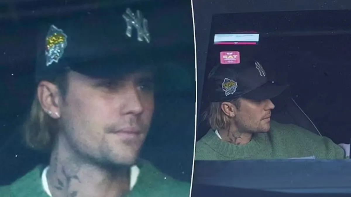 Justin Bieber was spotted looking visibly strained while stepping out with his wife, Hailey, in Beverly Hills on Monday, just days after the tragic death of fellow musician Liam Payne and the scandal involving his former mentor, Sean “Diddy” Combs. The couple was seen driving their sleek Cybertruck as they exited an office building, with Bieber appearing in the passenger seat, clad in a casual green sweater and a Yankees baseball cap, signaling a somber mood.