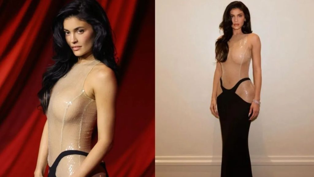 Known for her love of fashion, particularly the work of the late French designer Thierry Mugler, Kylie made a glamorous nod to Mugler’s legacy with this daring number. The semi-sheer gown left little to the imagination, further accentuating her curves. She completed the look with a long nude manicure and styled her signature dark locks in voluminous Hollywood waves, channeling old-school elegance with a modern twist.