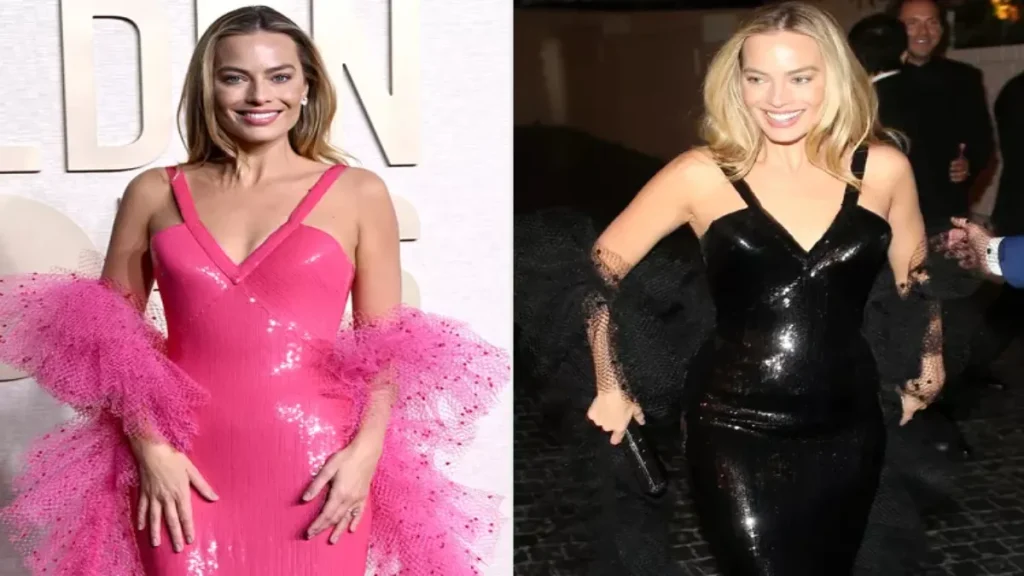 Margot Robbie, known for her role as Barbie and as a co-producer, made a dazzling appearance at the 2024 Golden Globes afterparty held at Chateau Marmont in Los Angeles. She stole the spotlight by donning a striking black rendition of her custom Giorgio Armani Privé gown, originally inspired by the iconic 1977 SuperStar Barbie. This stunning outfit had made its debut earlier on the red carpet at the Beverly Hilton, capturing attention with its floor-length silhouette adorned with sequins and a V-neck cut.