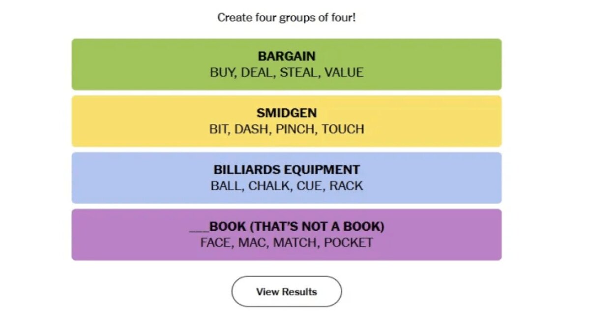 In Connections, the objective is to sort a grid of 16 words into four groups of four based on a shared connection. For instance, a group might consist of four words related to fruits. The connections are color-coded by difficulty: yellow (easiest), green, blue, and purple (most difficult). You have four attempts to find all four groups.