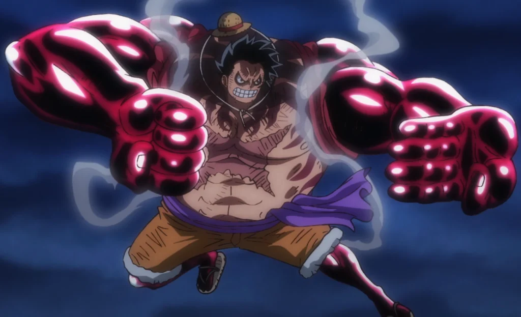 Gear 4 operates on a principle of compression rather than elasticity, significantly enhancing Luffy’s speed, strength, durability, and range of attacks. Employing Armament Haki extensively, Luffy reinforces his limbs and body while inflating his muscles, towering at nearly four meters tall. Moreover, Gear 4 encompasses multiple variations tailored to diverse combat scenarios, including Boundman, Snakeman, and Tankman. Each variant offers distinct advantages, with Boundman amplifying Luffy’s physical prowess to unprecedented levels and enabling aerial maneuverability, while Snakeman emphasizes agility and versatility in combat.