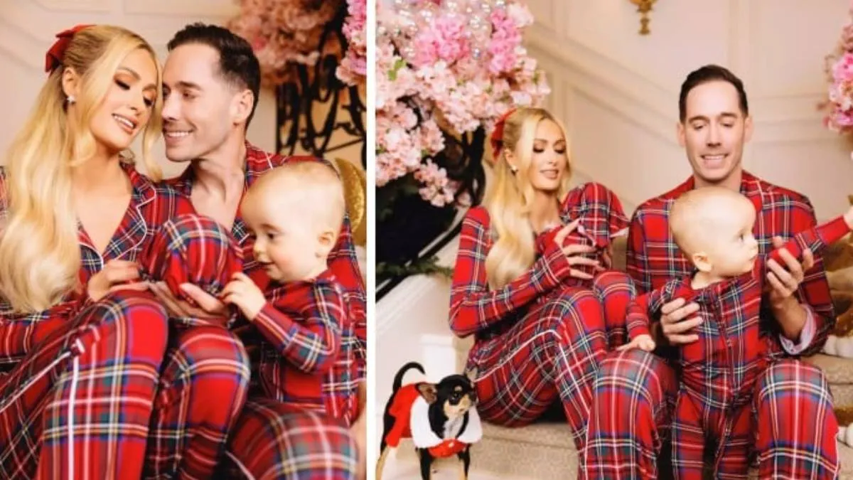 #ParisHilton poses with her babies, husband in matching pyjamas in family #Christmas pictures