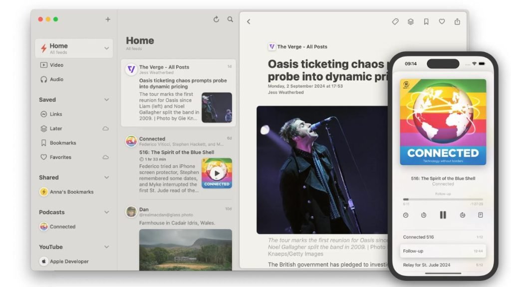 The redesigned Reeder prioritizes versatility and user experience. While the older version, now called Reeder Classic, supported various sources, it lacked an optimal viewing experience for these diverse types of content. According to the developer, “What some people may not realize is that most of the content the new Reeder supports — like YouTube, Reddit, and Mastodon — could already be consumed with Reeder Classic. So, in that sense, not much has changed.” The new app has been completely rebuilt from the ground up, providing a customized viewing experience that accommodates various content types, such as articles, photos, videos, and podcasts.