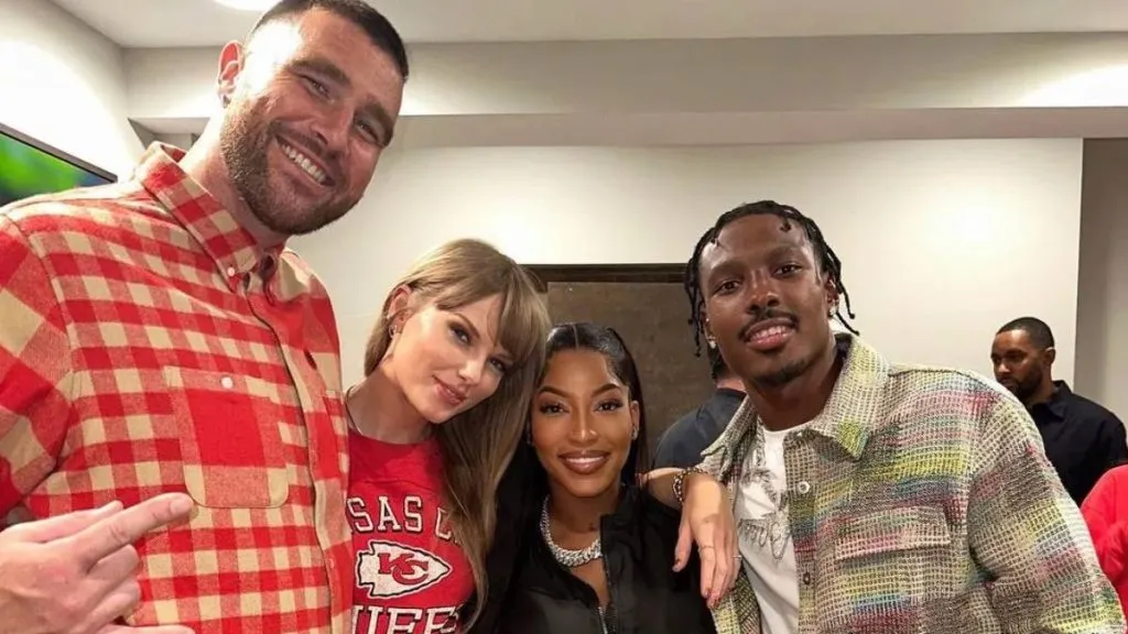 The Grammy winner planted a sweet on the athlete’s cheek as they posed for photos, alongside Kelce’s teammate Mercole Hardman and his partner, Chariah Gordon, at a post-game party.