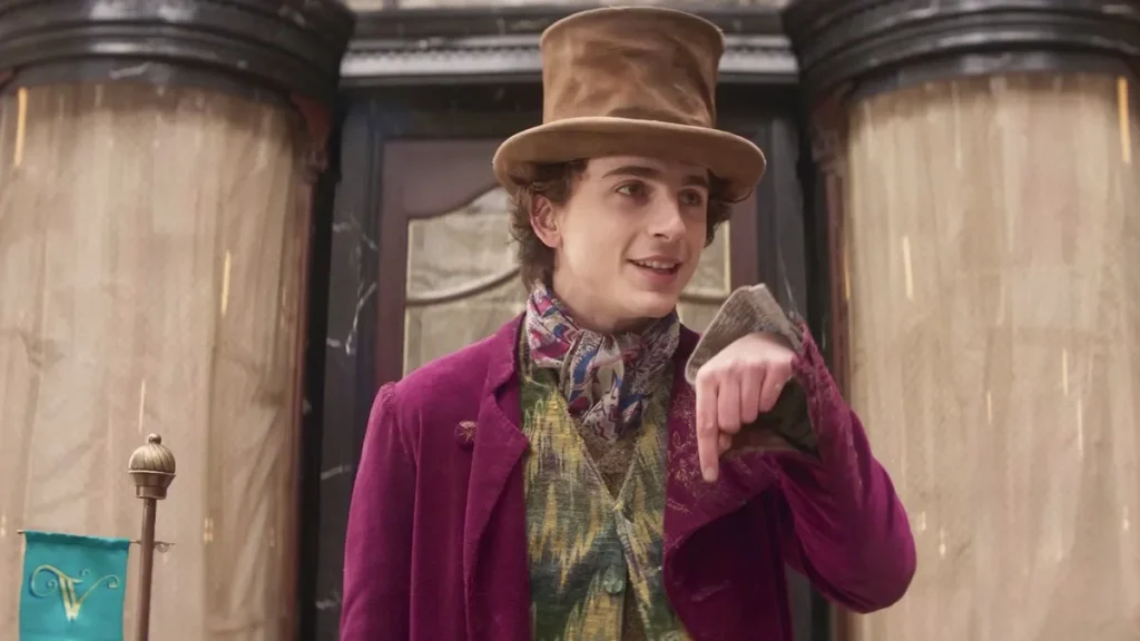 Timothée Chalamet’s portrayal of a youthful Willy Wonka, exploring his early days and the formation of his candy empire.